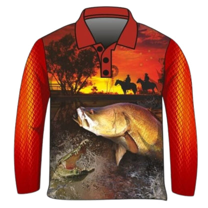 Looking for a fishing shirt that will keep you cool and comfortable on those hot, summer days? Look no further than the Country Crab Croc Red Shirt featuring the Barramundi, Crocodile, Mud Crab Horse and men on Horseback. It's a combination of staying comfortable and looking stylish no matter the situation! Put your best foot (or claw) forward and make a statement.