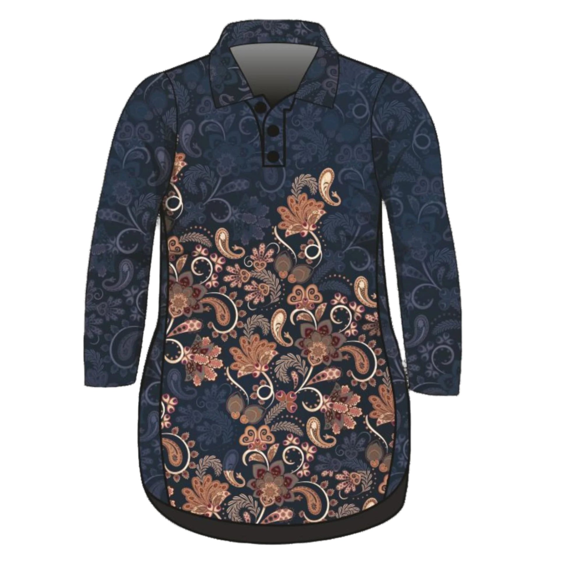 Our Navy Paisley Lifestyle Dress features a paisley print in shades of navy and desert browns, making it perfect for any western-themed event. Whether you're attending a rodeo or a country music concert, this dress will have you looking your best. 🌵 Staying sun safe never looked so good!